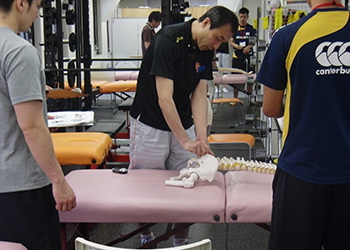 教科書的な理論はもちろんのこと、講師が実際にその症例に出会った際に経験した選手の特徴的な訴え方、医師とのやり取りなど、参考書に載りにくい実際のエピソードをできる限り交えられた解説を聞きながら、評価部位の正確な触診、的確なストレスのかけ方など、しっかりとスキル習得を目指せることが、このアカデミーの特徴です。