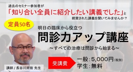 長谷川尚哉先生の「問診力アップ講座 〜すべての治療は問診から始まる〜」が2019年12月17日(日)に開催が決定しました!!