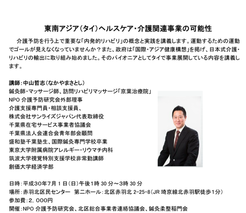 介護予防を行う上で重要な「内発的リハビリ」の概念と実践を講義します。運動するための運動でゴールが見えなくなっていませんか?また、政府は「国際・アジア健康構想」を掲げ、日本式介護・リハビリの輸出に取り組み始めました。そのパイオニアとしてタイで事業展開している内容を講義します。