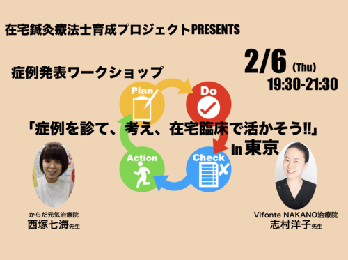 今回、若手鍼灸師2人による症例発表を通して、参加者みんなで「症例を診て、考え、在宅臨床で活かそう!!」というワークショップを開催します。